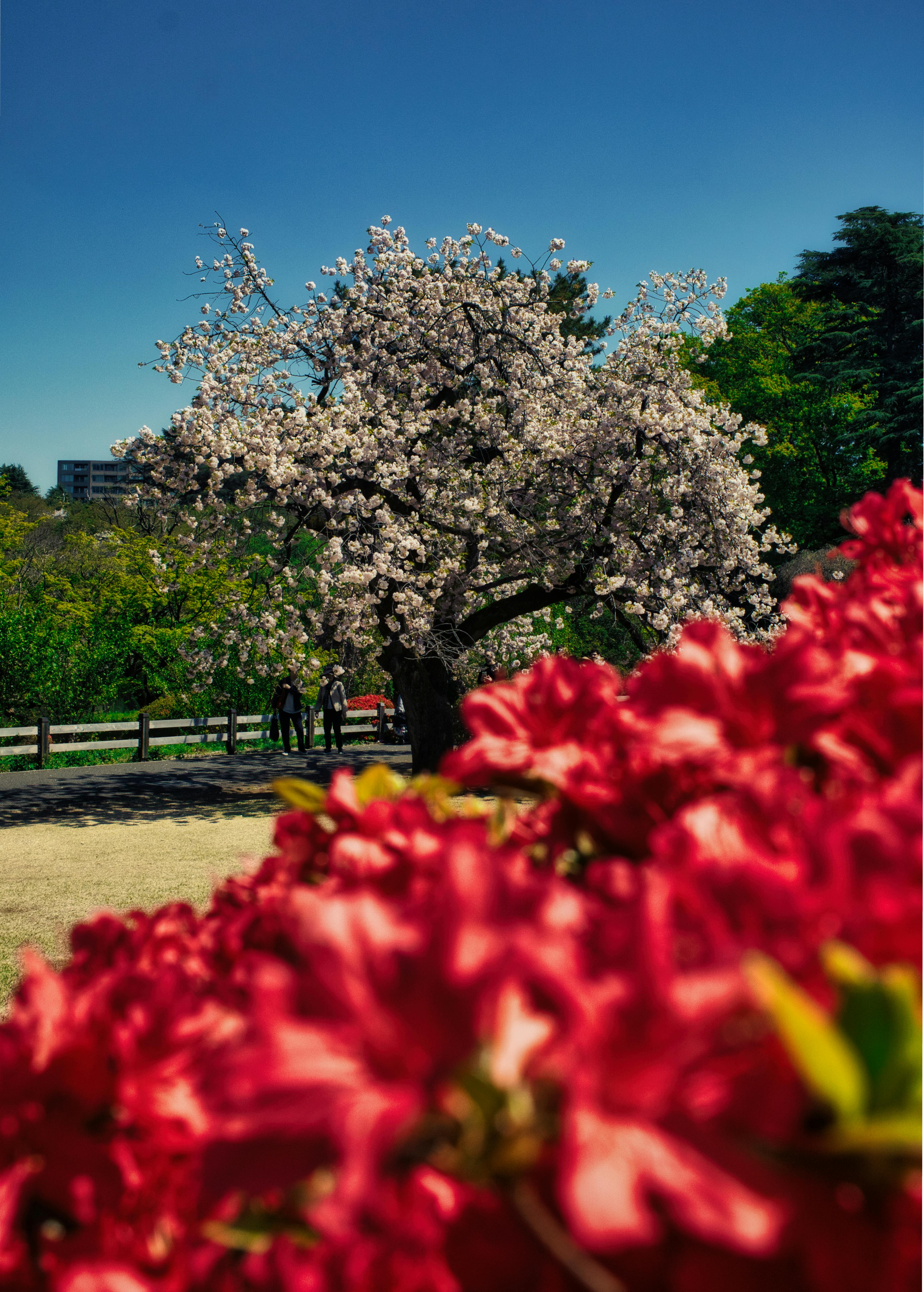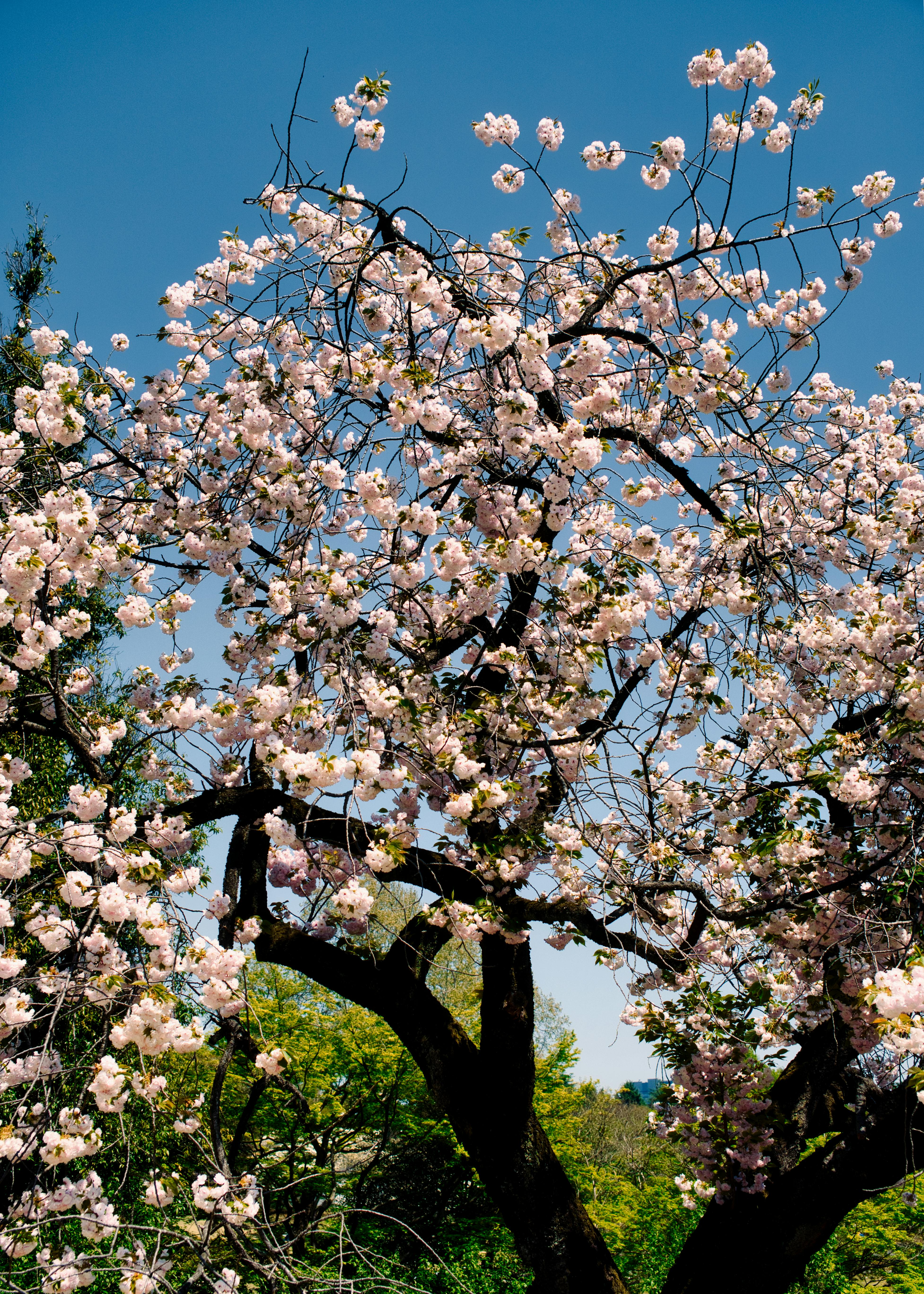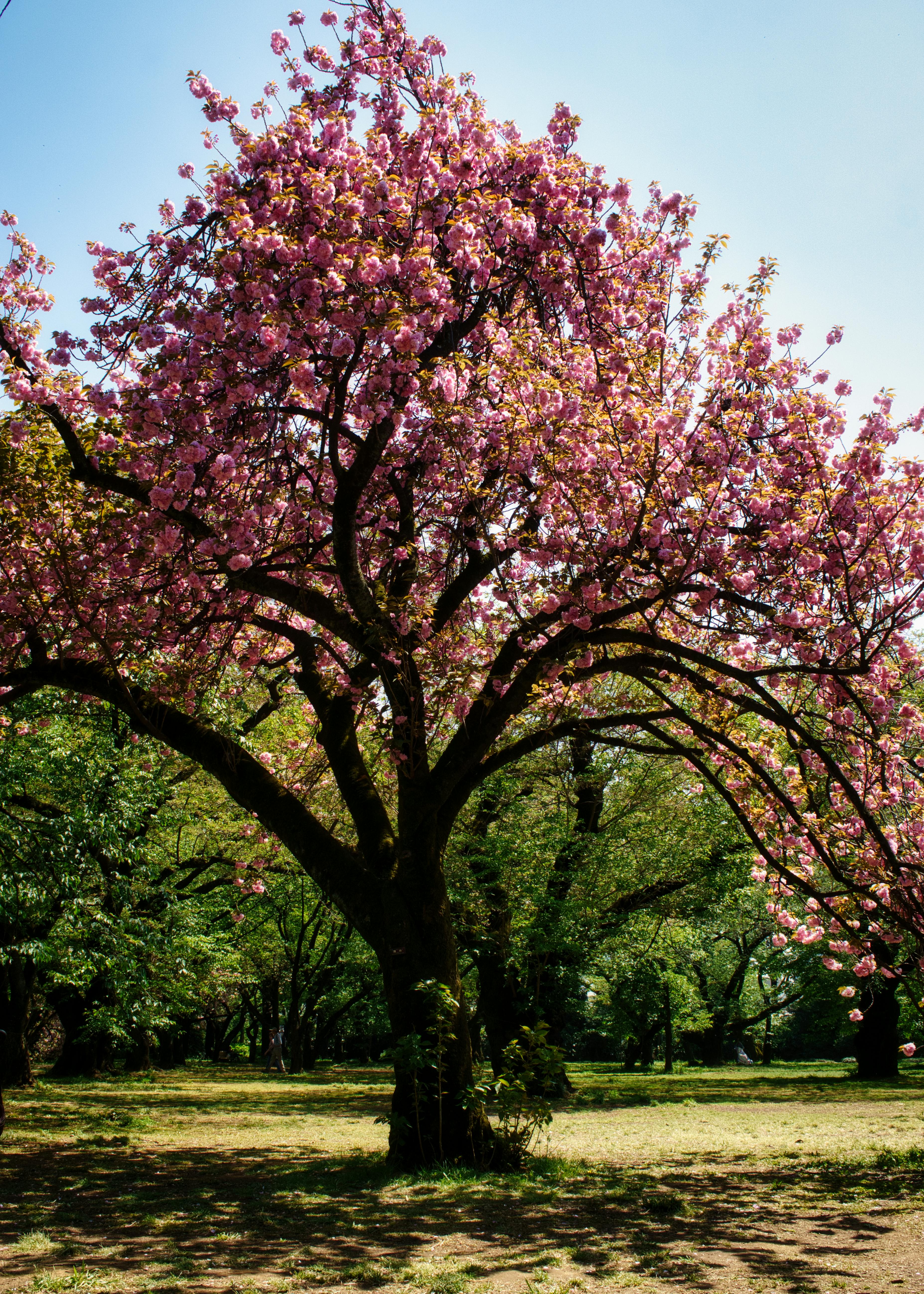 A majestic sakura tree standing tall, adorned with countless blossoms in Shinjuku Gyoen.