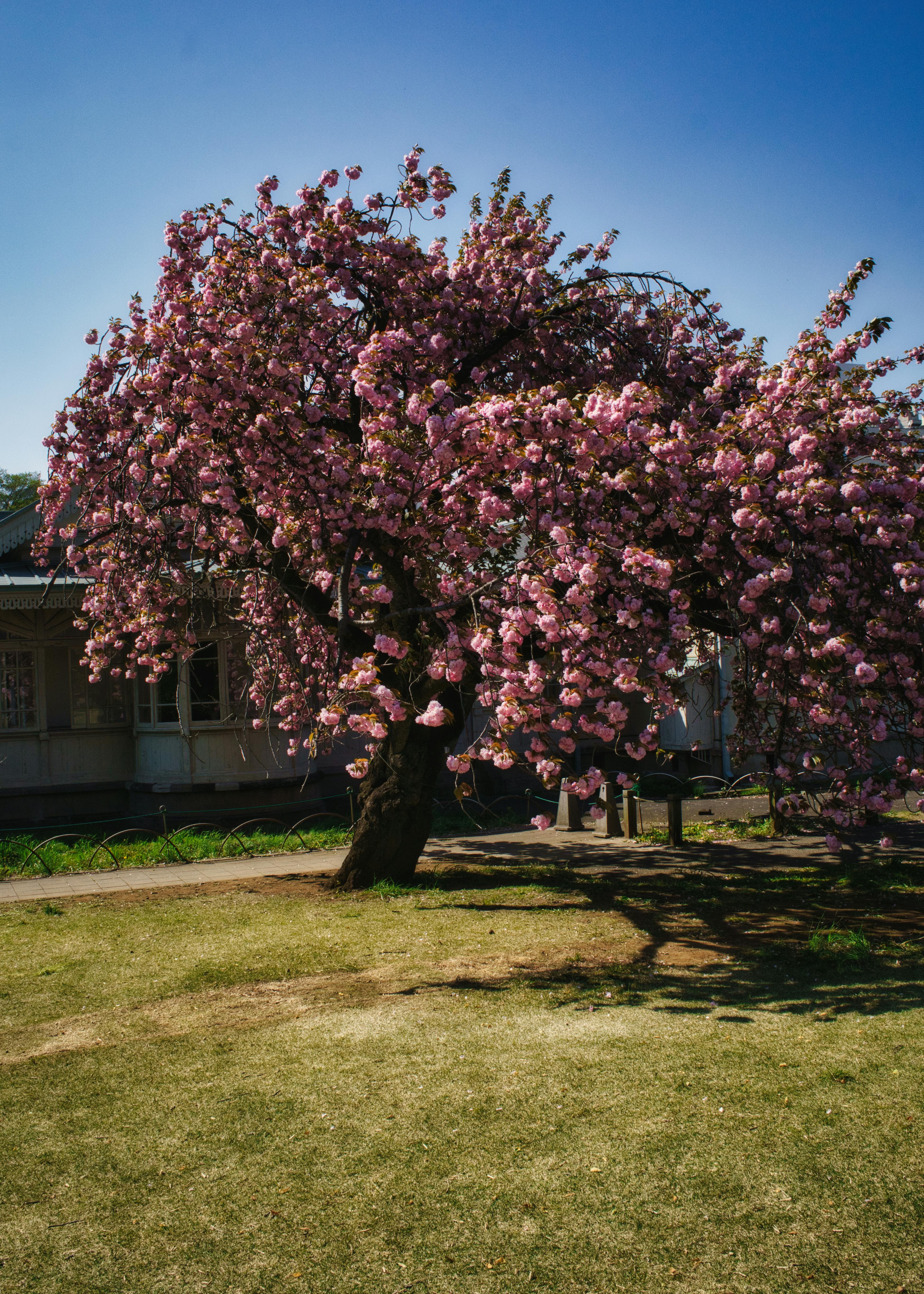 A magnificent cherry blossom tree forming a vibrant canopy against the clear Tokyo sky.